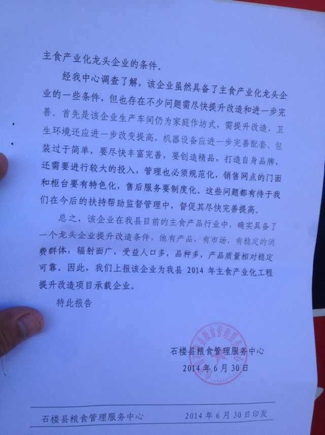祝賀,山西石樓縣政府為了給廣大群眾提供放心,良好的主食產(chǎn)品,重點(diǎn)在全縣挑選培植主食龍頭企業(yè),一品鮮山西呂粱石樓店被石樓縣糧食局認(rèn)真調(diào)查了解,考察論證,附和條件,終上報(bào)呂梁市糧食局,被確定為2014年度石樓縣主食產(chǎn)業(yè)化工程提升改造項(xiàng)目承載企業(yè)。
